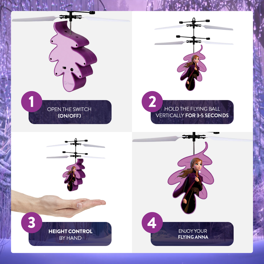 Introducing the Disney Licensed Frozen II Anna Motion Sensing IR UFO Helicopter! Featuring a coaxial rotor system for precise movement and increased stability when hovering. The UFO Helicopter body is also constructed with a durable material making it strong yet lightweight so you don't have to worry about breaking anything when it lands a bit too rough. Simply turn on and launch to get started, holding your hand underneath it will keep it hovering up in the air. When you're done flying try and grab it carefully and switch off the power! A must have for fans of helicopters, get the Disney Licensed Frozen II Anna Motion Sensing IR UFO Helicopter today!