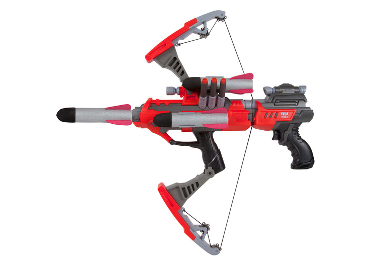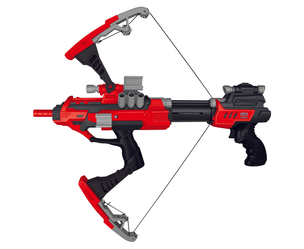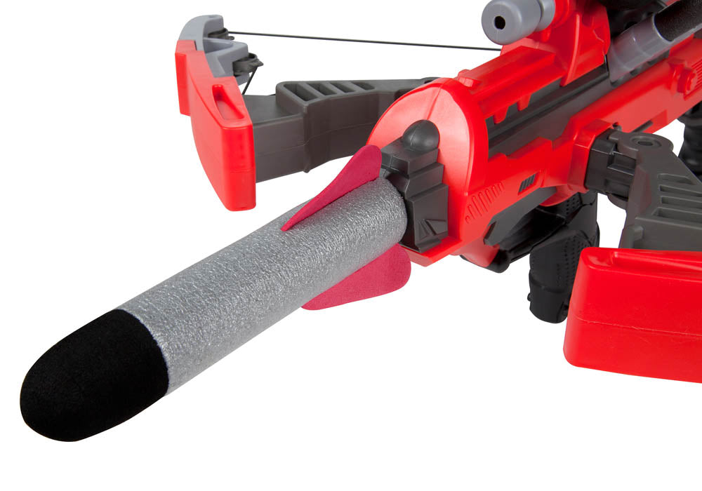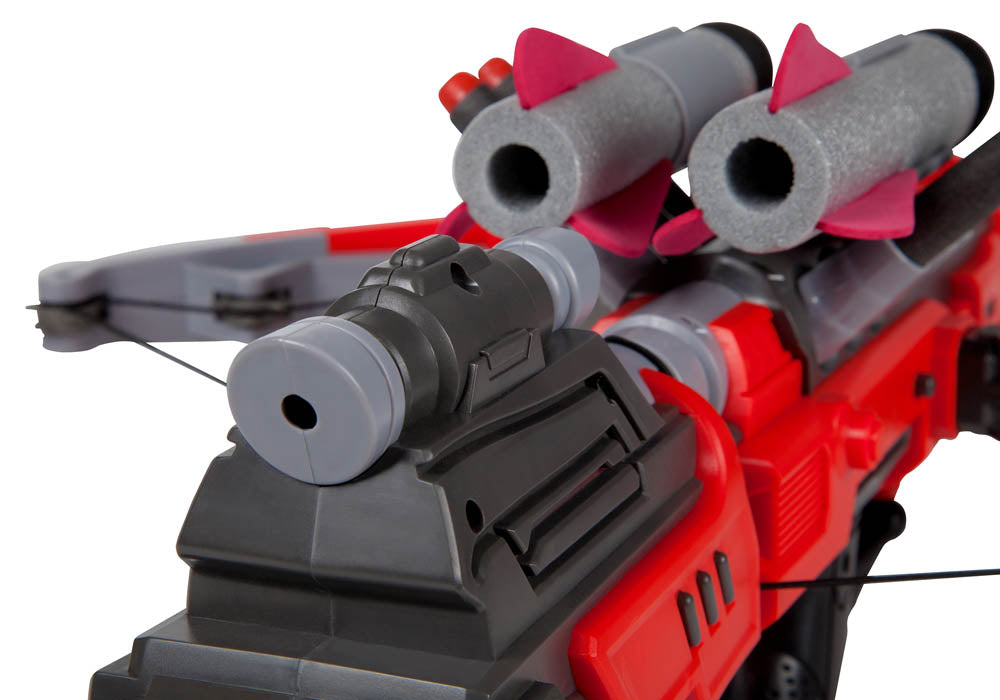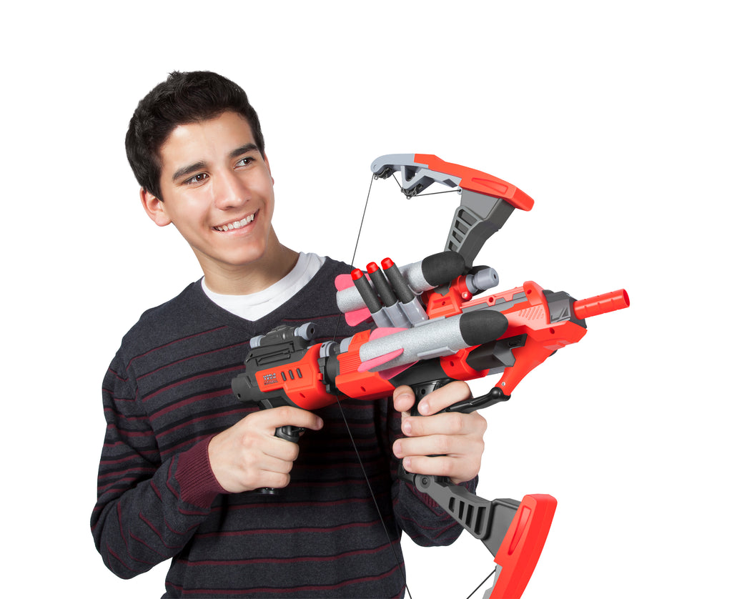 ¡Bombardea al enemigo con el lanzador de dardos Phoenix - World Tech Warrior! Con un alcance de hasta 20 metros, el Phoenix te mantendrá un paso por delante de la competencia. Cambia fácilmente entre dardos clásicos y misiles de espuma. ¡El Phoenix maneja ambos! También puedes cambiar entre los modos arco y ballesta con los brazos desmontables para arco compuesto. Un sistema de retroceso de empuñadura, almacenamiento para dardos y misiles, y una mira trasera lo convierten en un lanzador increíble. ¡Toma las armas y elimina al enemigo con el poderoso lanzador de dardos Phoenix!