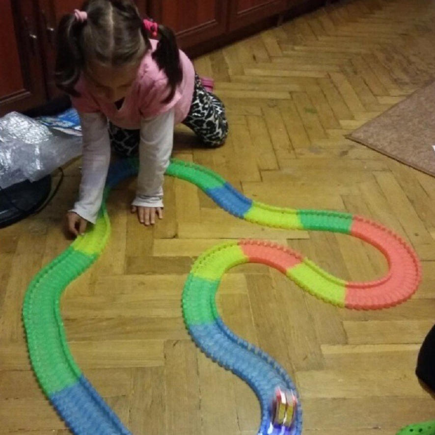 This is one of the best purchases I’ve ever made for my 4 yr old. They are not a fixed pattern track. They can be assembled and shaped in an infinite number of shapes! The tracks glow in the dark and make for an awesome effect. My son likes to make the track turn in between all our furniture and under little tunnels he makes out of clothes and other living room items to add to his fun. This you really gets his imagination going! I cant recommend this toy enough!