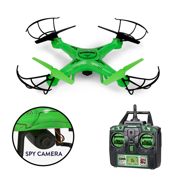 Explore and record with the Glow in the Dark Striker 2.4GHz 4.5CH Camera RC Spy Drone! This awesome RC drone has a build-in picture and video camera which you can store and save data in a Micro SD memory card! The body is of durable plastic and conveniently lightweight. It also has 4 channel controls meaning you can fly up/down, forward/backward, strafe left/right and rotate left/right. The internal gyro means you'll always get a smooth flight. It also comes with a 2.4GHz transmitter, so radio interference won't be a problem! Enjoy recording fun fly times with friends and with the Glow In The Dark Striker Spy Drone!